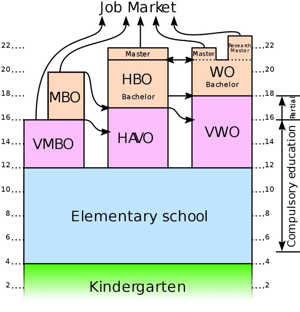 - VMBO -> HAVO -> HBO (4yr) = 9 years